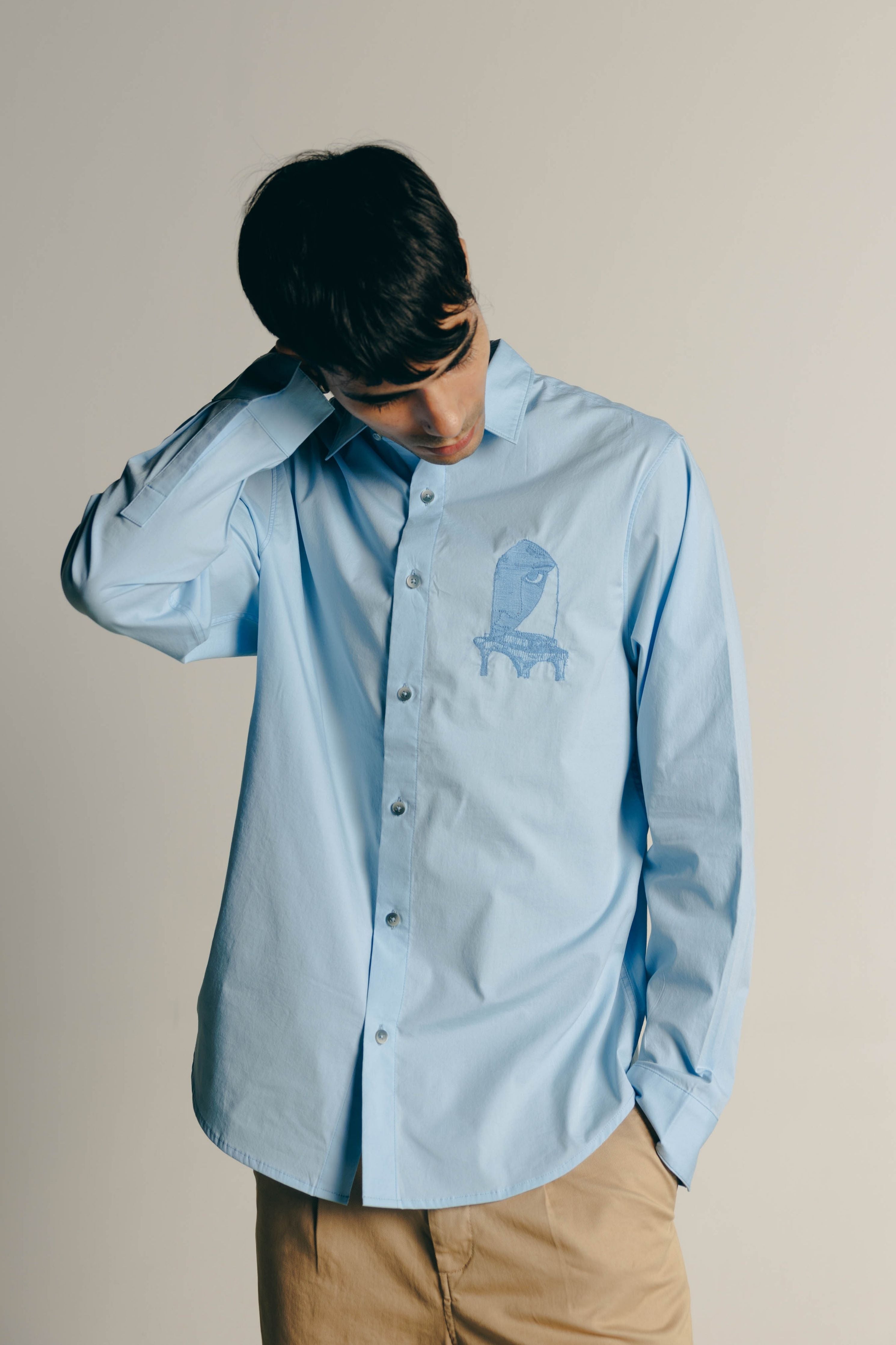 A shirt with a relaxed fit made from a stretch cotton poplin. The shirt has a machine embroidery of Jharokha-shaped arches and an enigmatic reveal of a face and an eye of the surrealist through the arch, highlighting the mysticism of their gaze.
