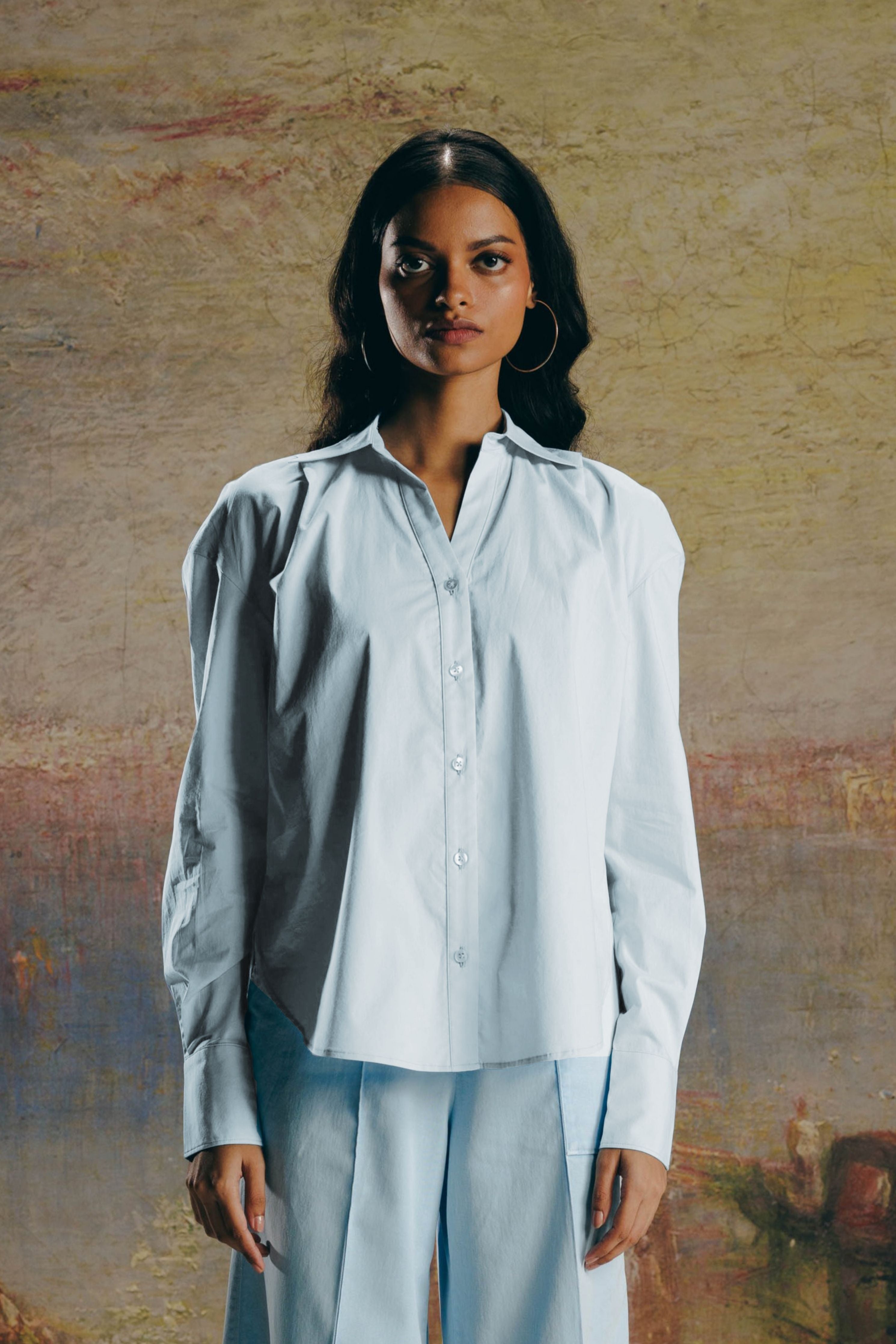 A vintage washed a-line shirt that has a relaxed silhouette with a subtle flare & drop shoulders, complete with button-down front. It has a machine embroidery ofJharokha-shaped arches and an enigmatic reveal of a face and an eye of the surrealist through the arch, highlighting the mysticism of their gaze.