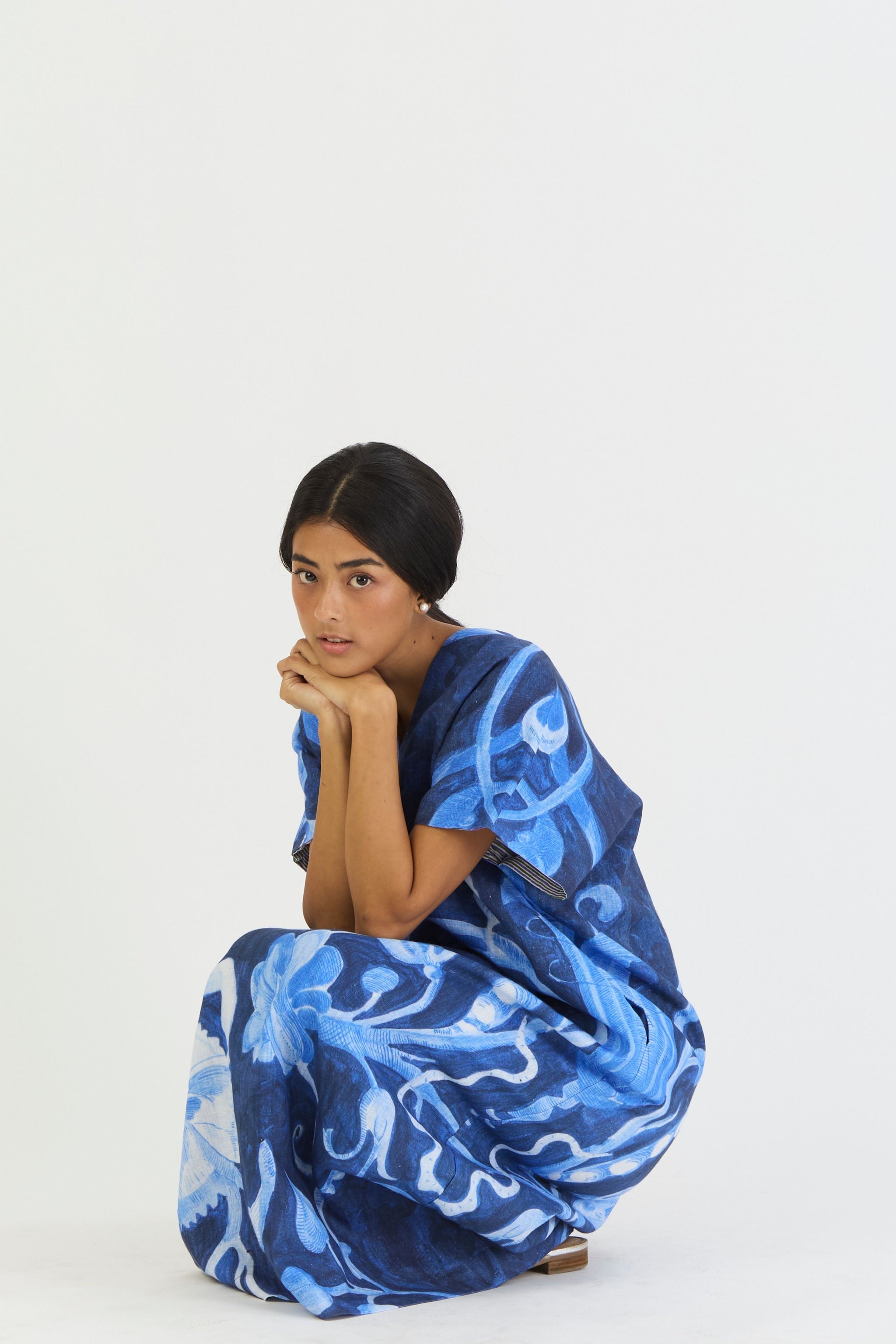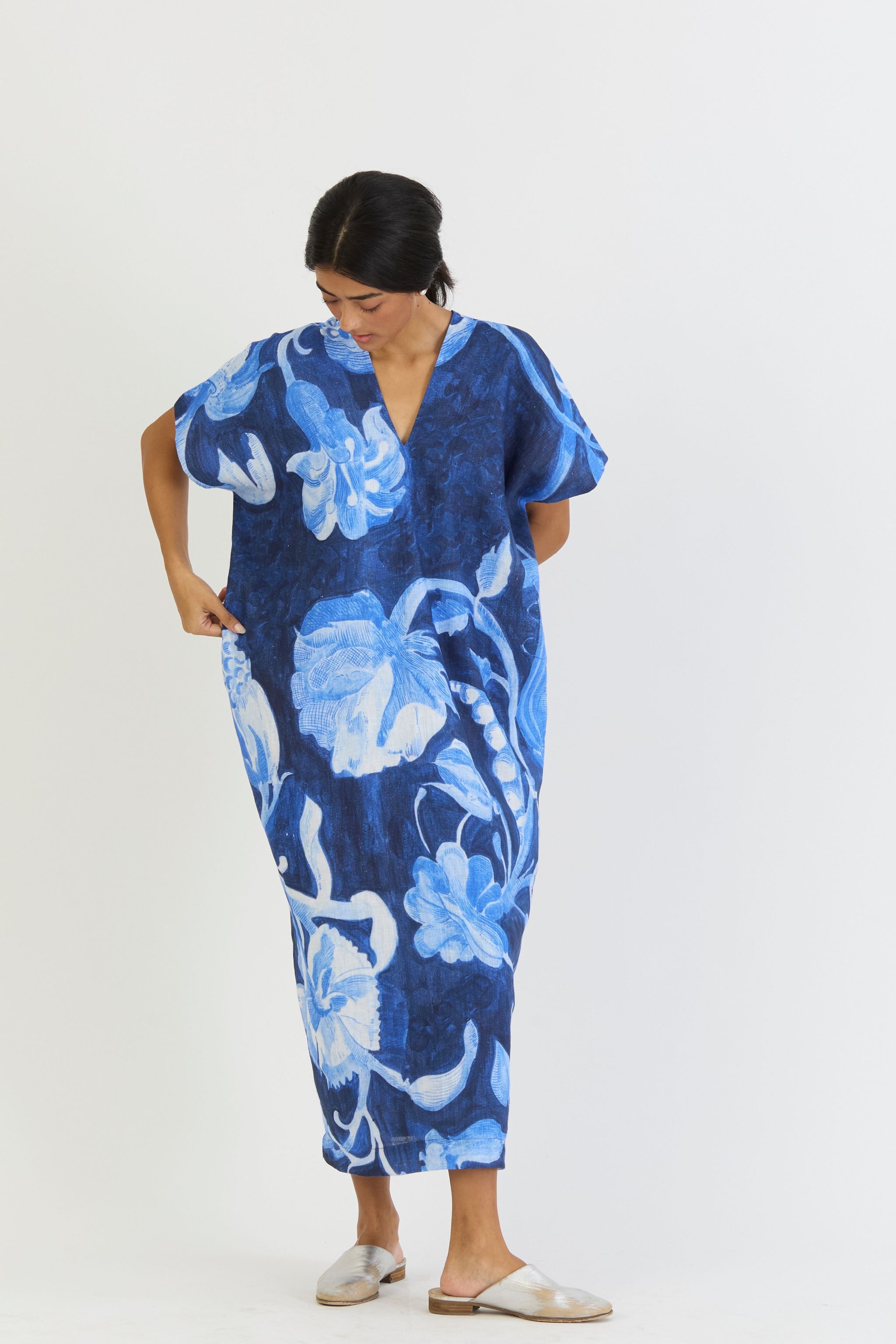 Bilberry is painted with gouache, utilizing the etching technique to create a lifelike feel. The hand-painted blue background enhances the print's authenticity, with each brushstroke reflecting the beauty of a vintage masterpiece.The premium Linen kaftan dress is crafted for both style and comfort. The kaftan dress features a V neckline on both the front and back, come with convenient side pockets.