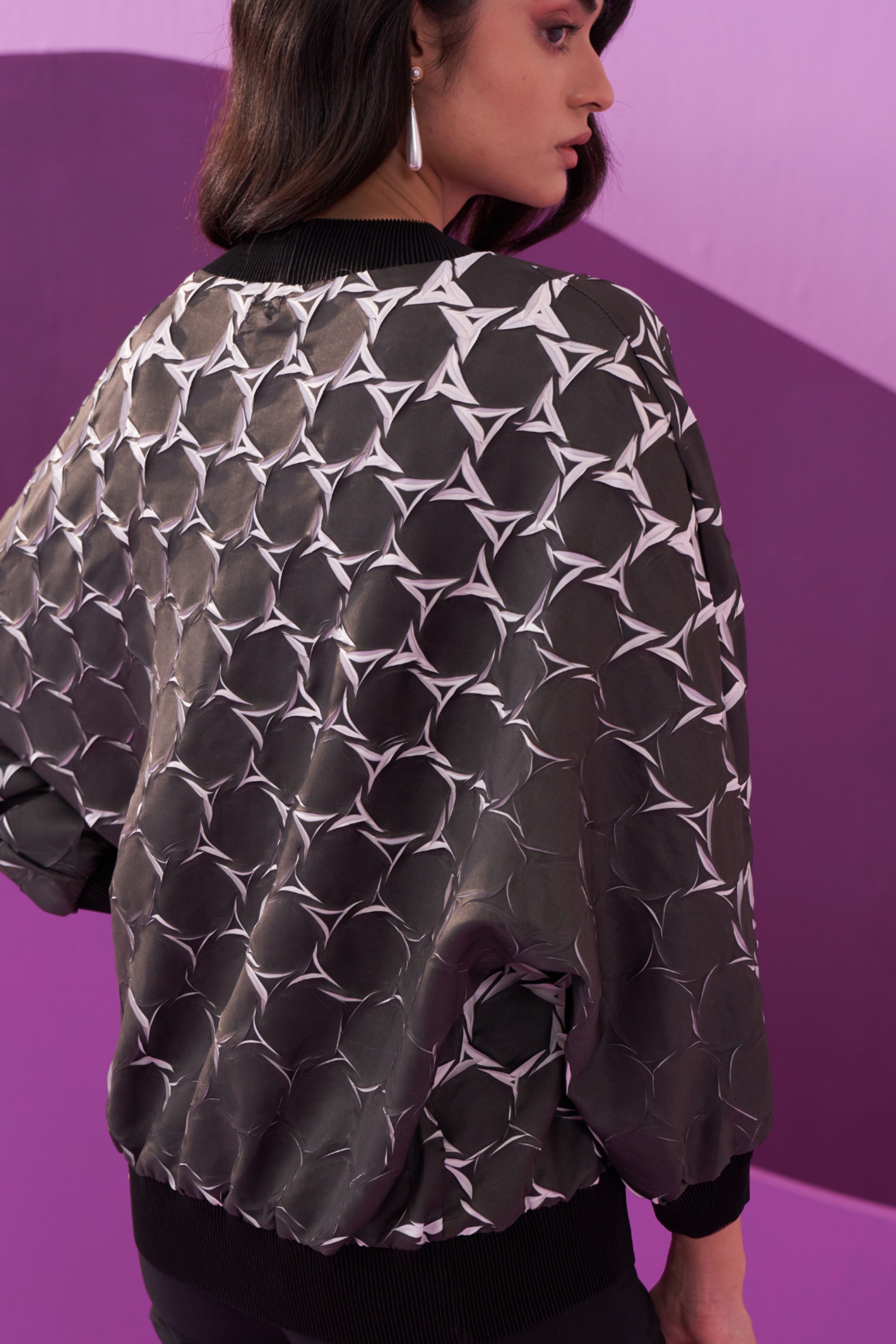Featuring A Black And White Round Neck Cardigan In Chevron 3D Pleats. It Has Rib Fabric At Collar, Sleeves And Bottom.This fits all sizes from XS to XXL.