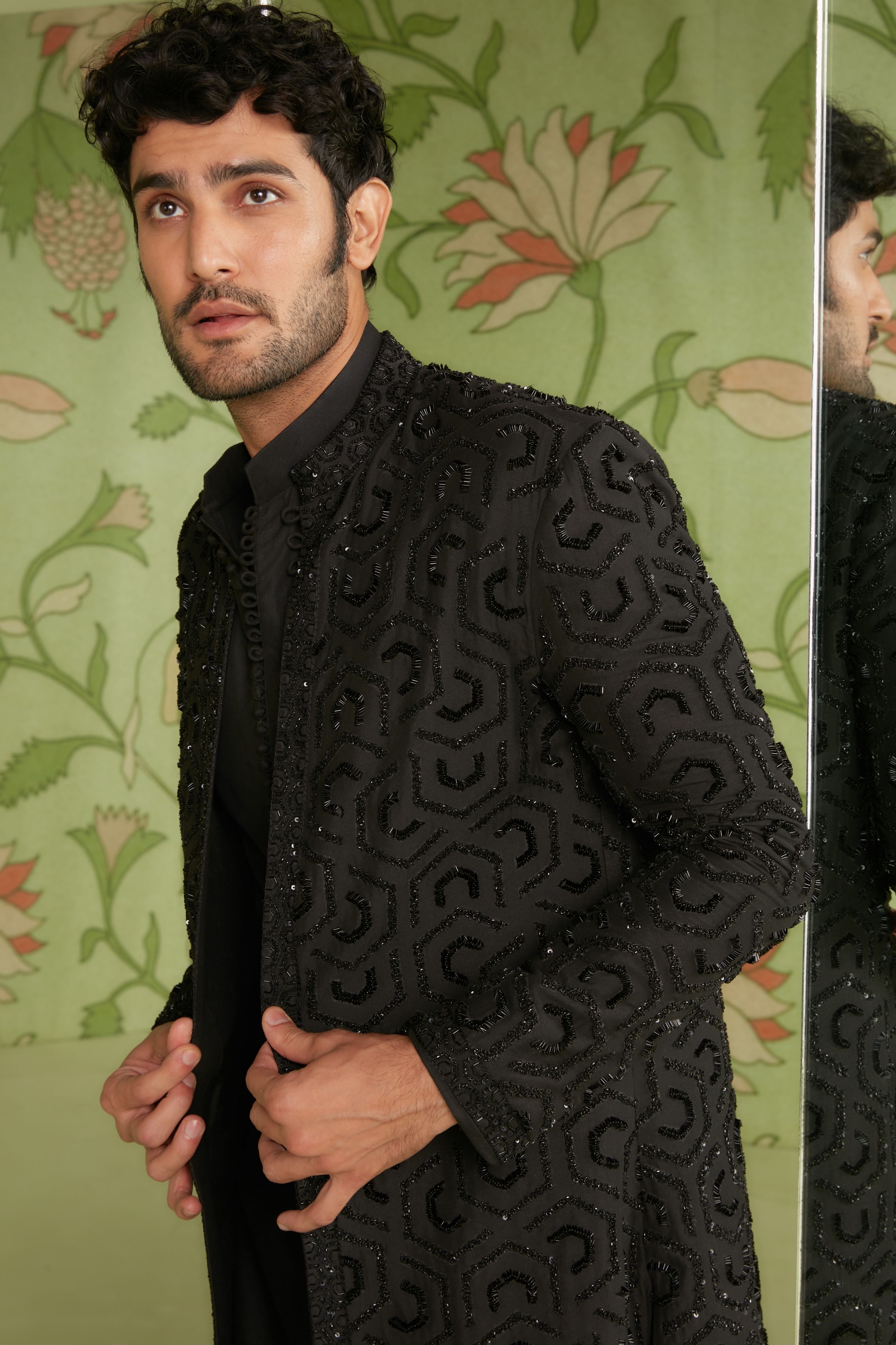 Long Jacket set embellished with 3D embroidery techniques embellished with beads, cut beads, sequins