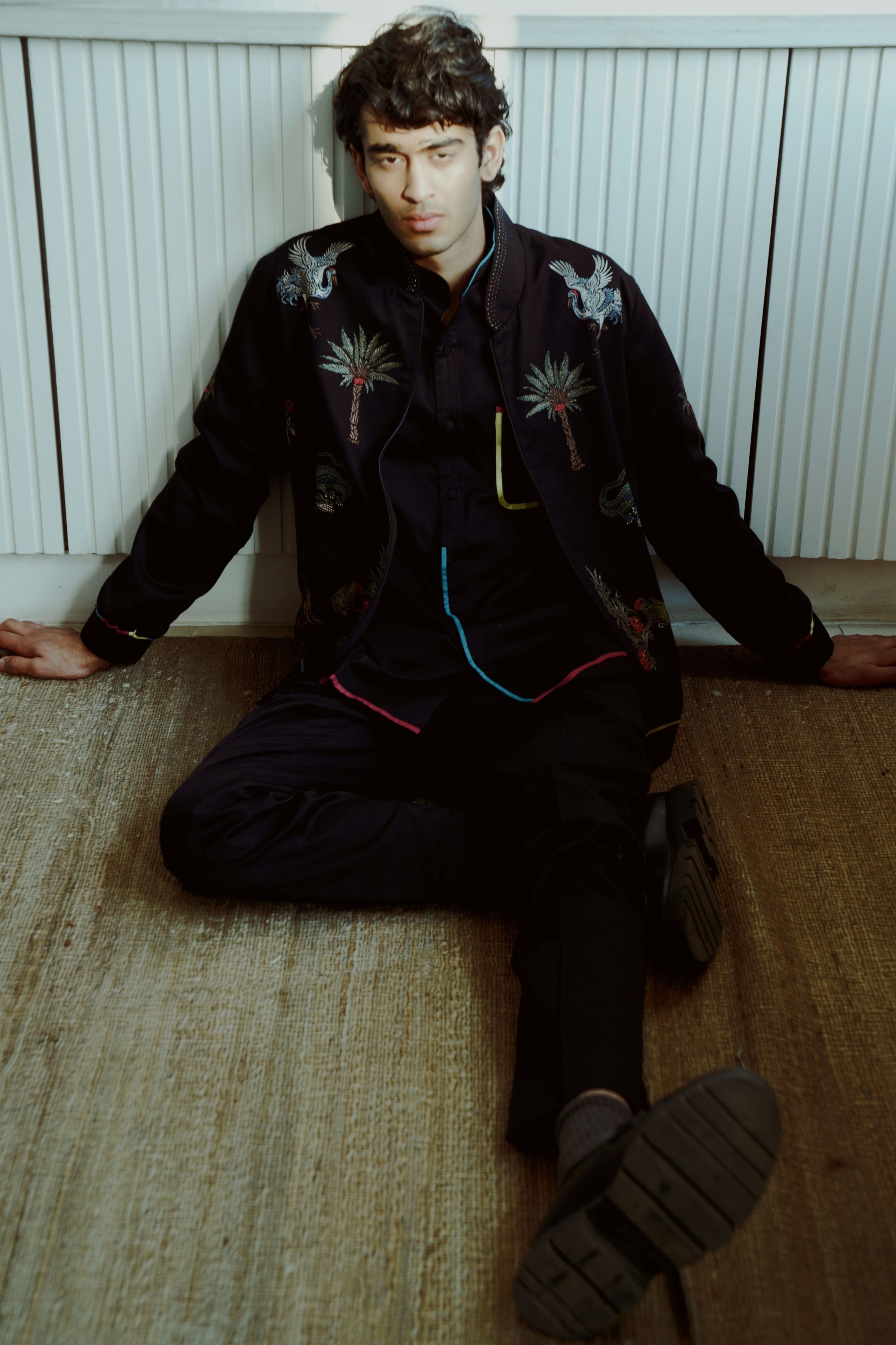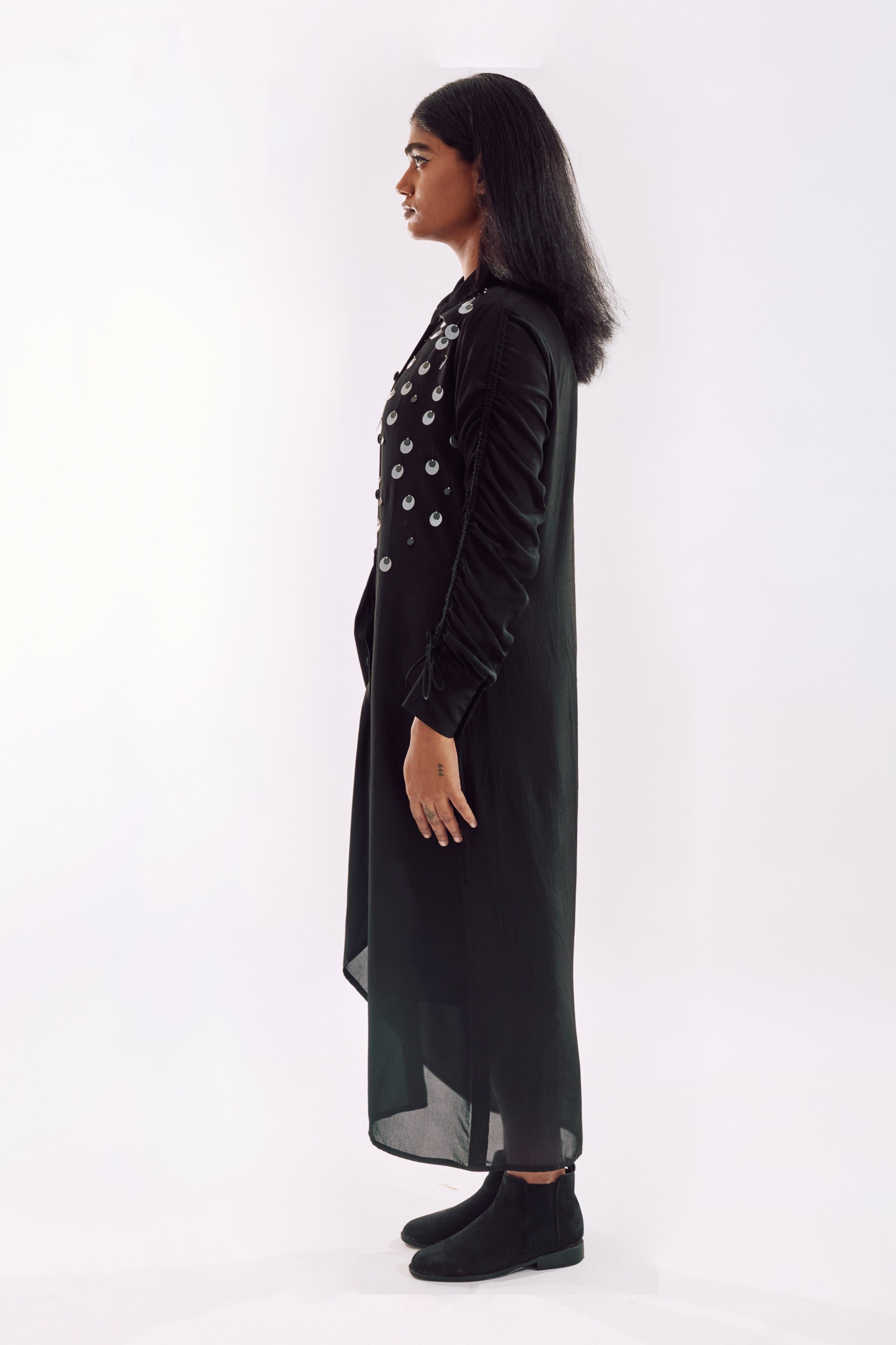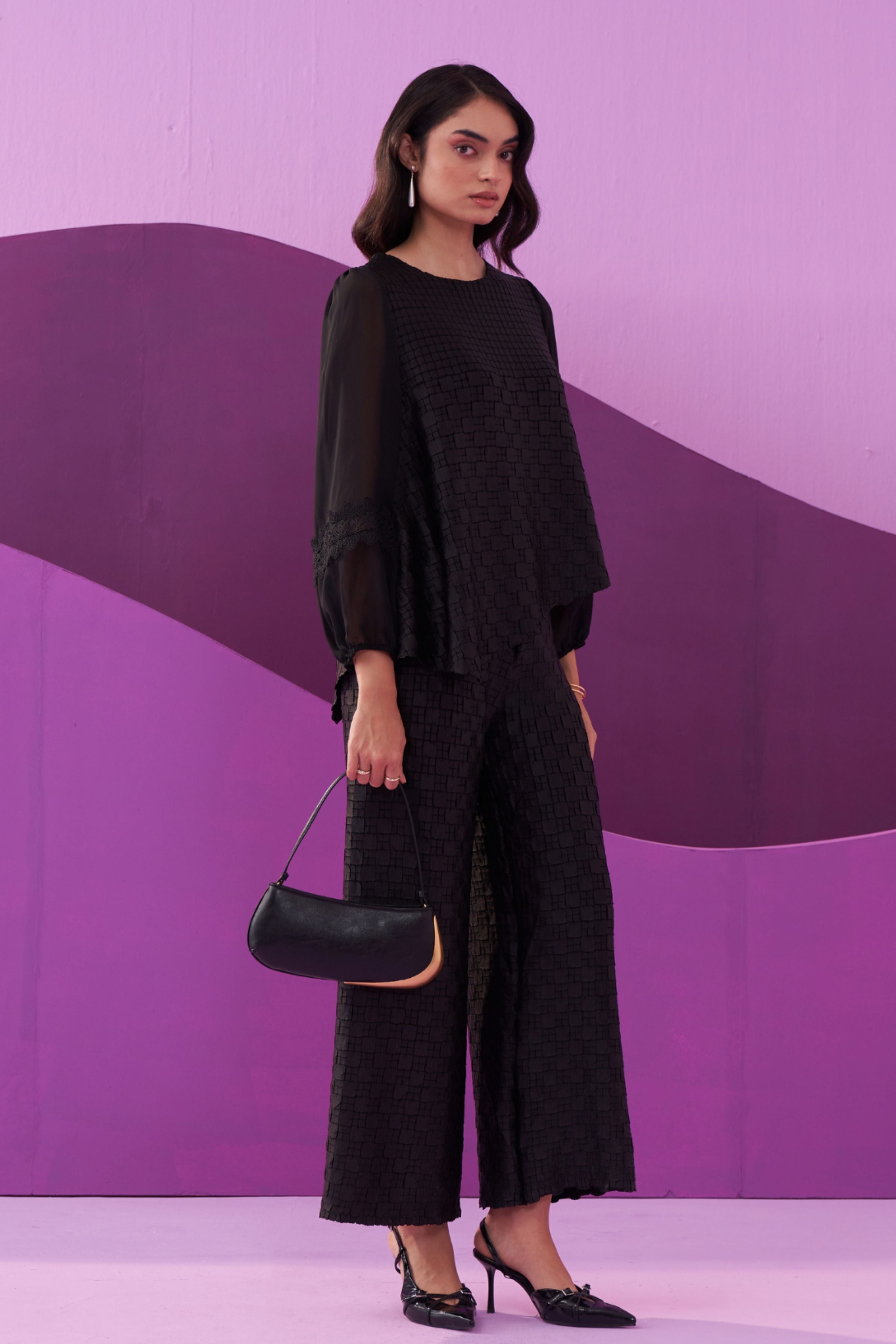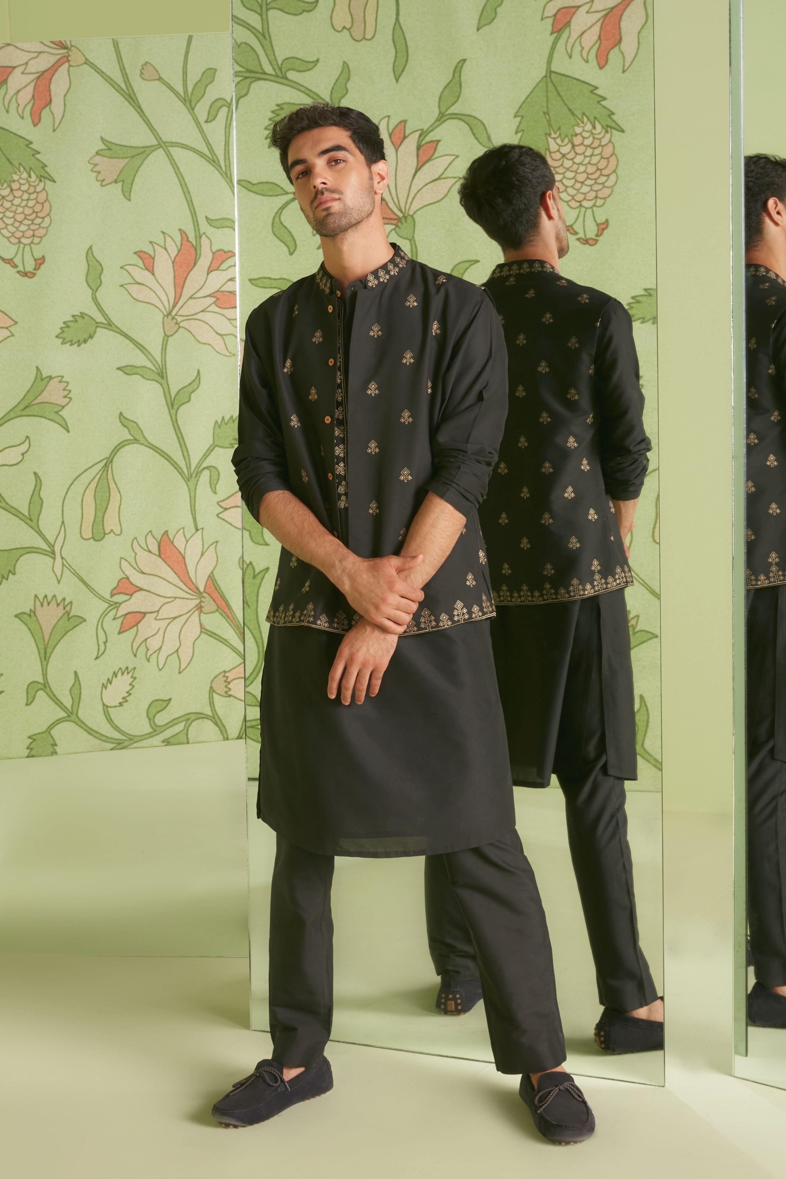 Black Coird Set With Cape Style Short Jacket And Embroidered Bustier