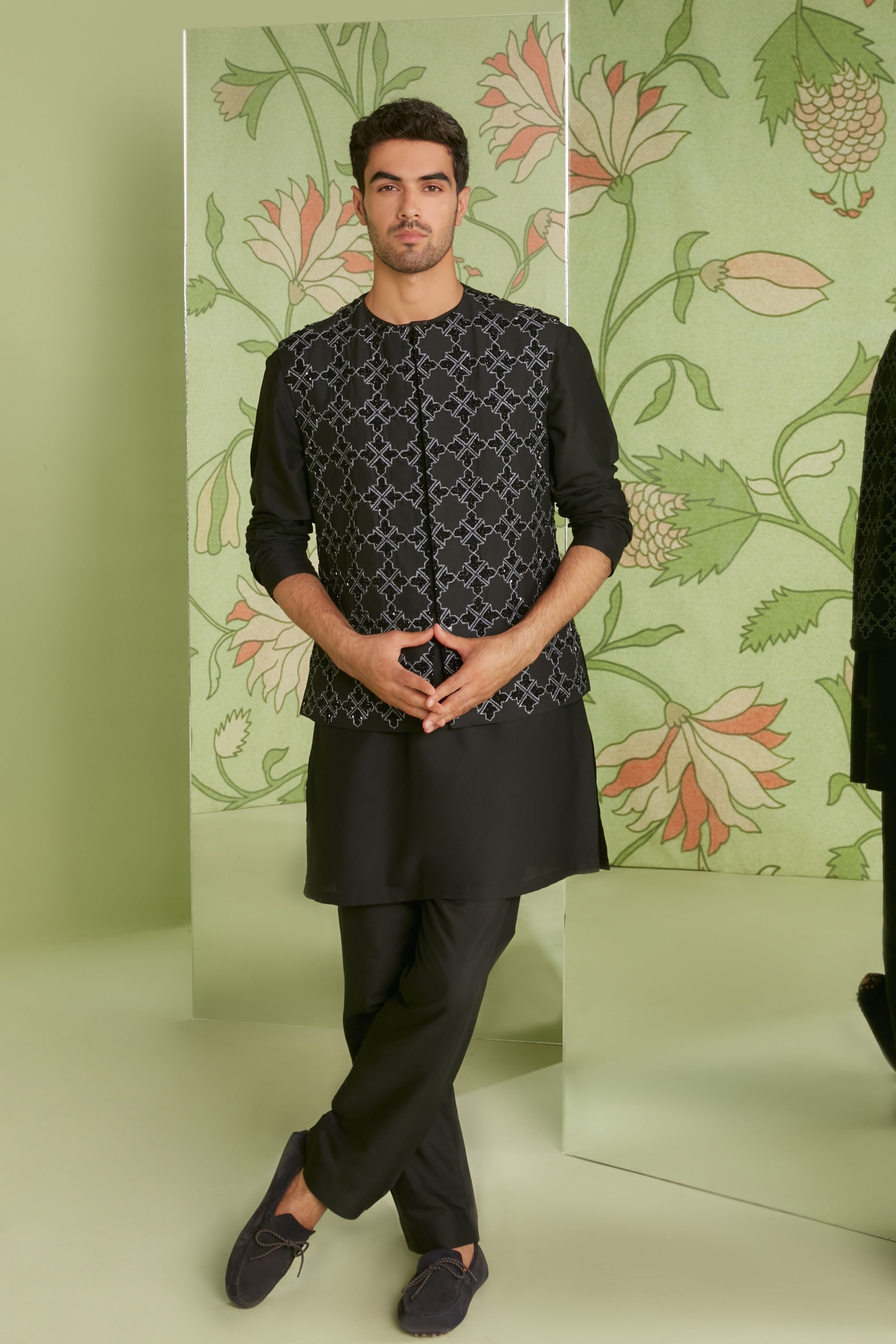Black Without Collar Bundi Kurta Set