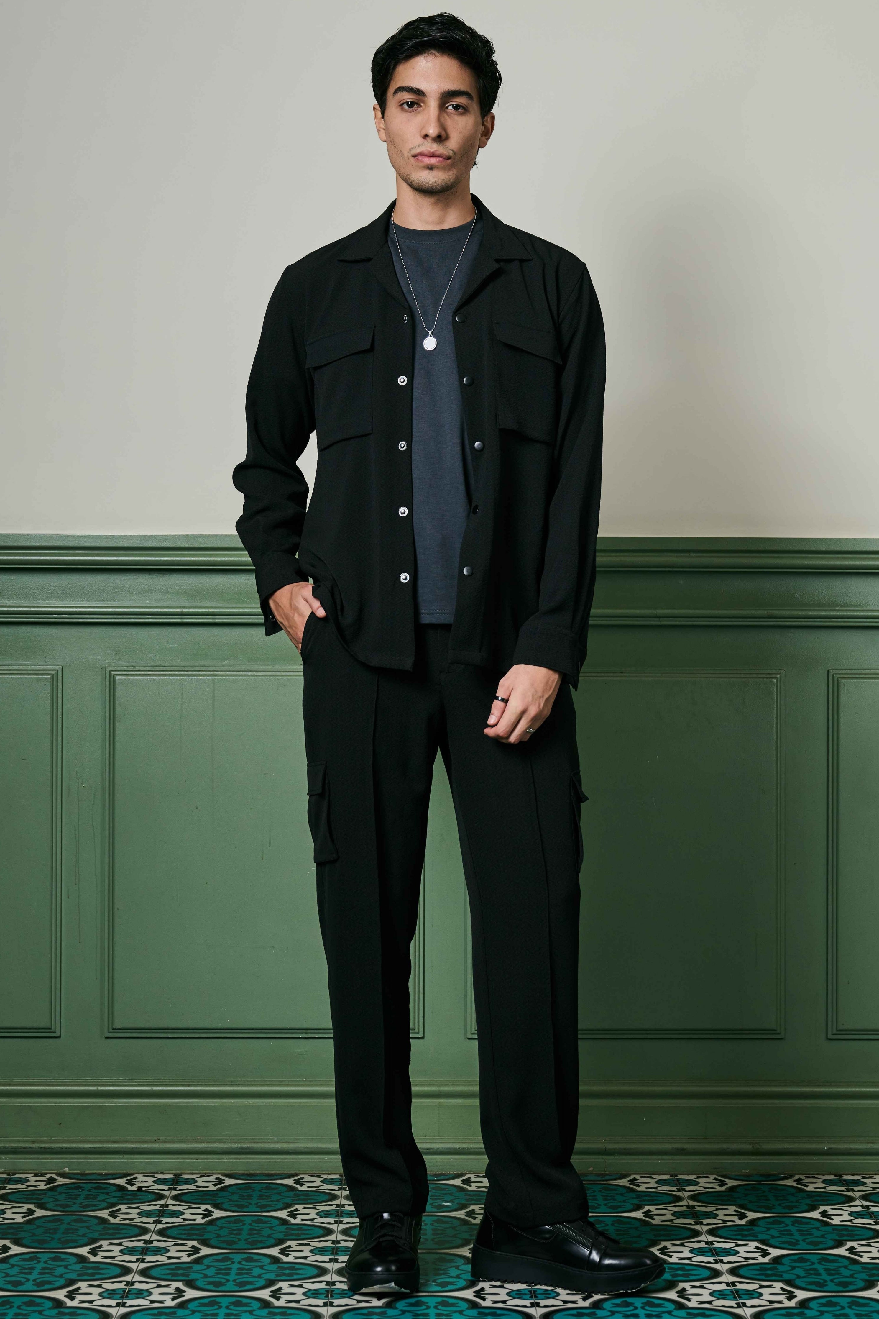 This Black Biscuit Crepe Co-Ord Set, Featuring A Classic Collared Jacket And Relaxed-Fit Trousers. The Shirt Boasts A Modern Geometric Texture, Chest Pockets With Flap Closures, And A Button-Down Front, Offering Both Style And Functionality. Paired With Matching Trousers That Include Side Cargo Pockets And An Elastic Waistband For Comfort, This Co-Ord Set Is Perfect For A Contemporary, Chic Look. Ideal For Casual Outings Or Semi-Formal Events, This Set Ensures You Stay Fashionable And Comfortable Throughout The Day.