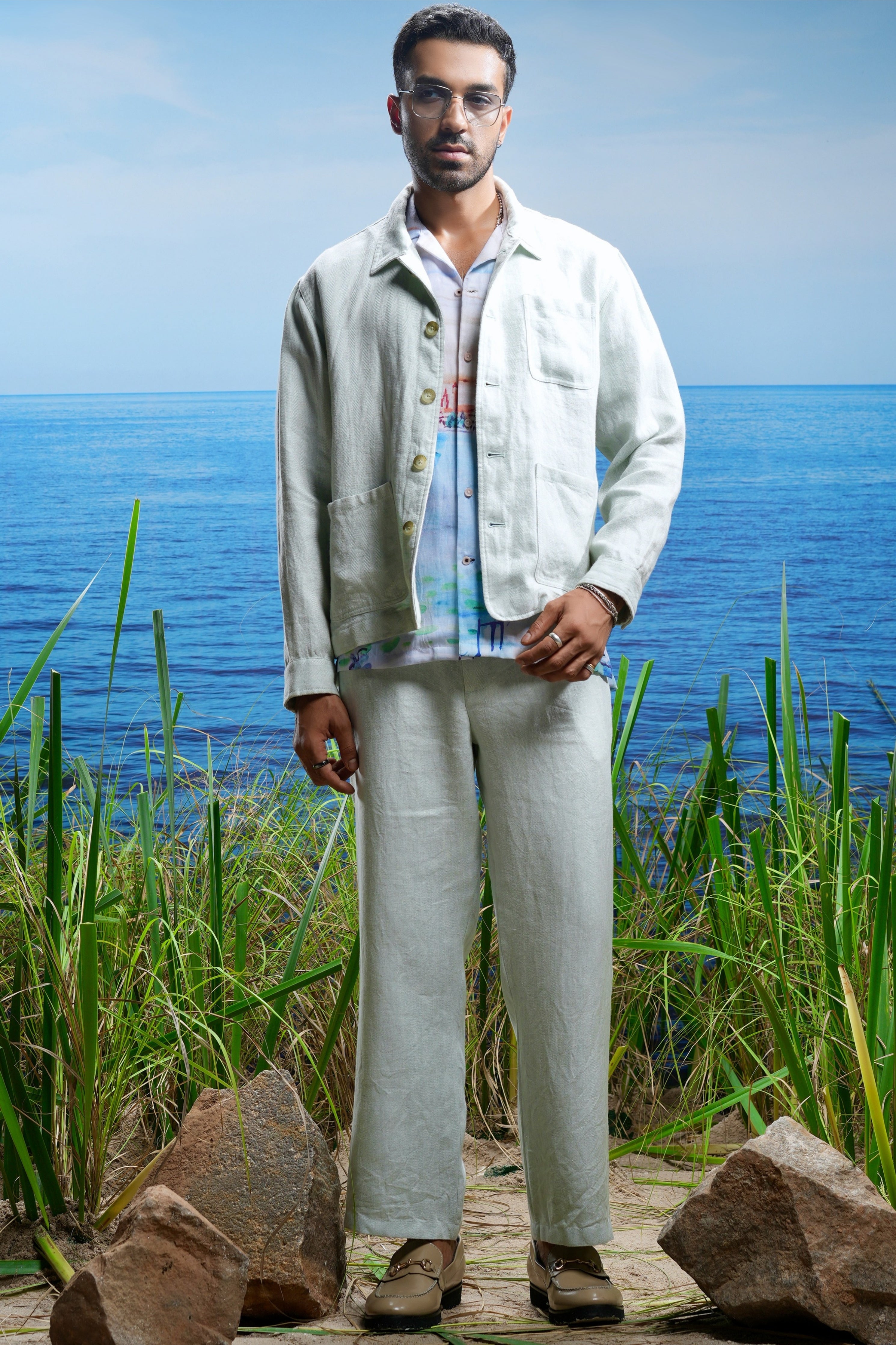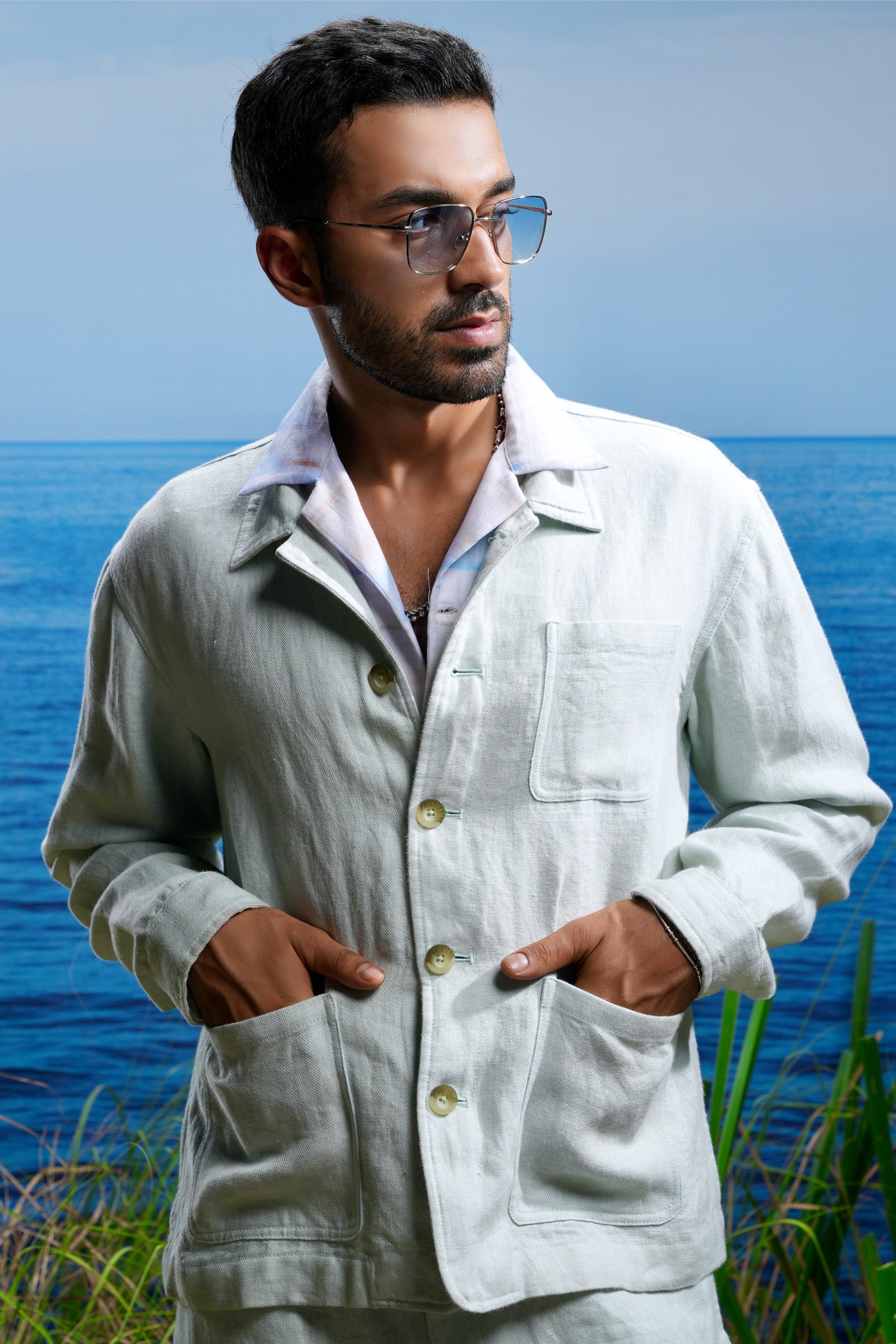 Embrace Effortless Style With The Sage Herringbone Linen Coord Set. Crafted From Premium Herringbone Linen In A Soft Sage Green Hue, This Set Is Both Stylish And Comfortable. The Jacket Features A Classic Button-Up Front, A Rounded Collar, And Four Spacious Pockets. The Matching Trousers Offer A Relaxed, Straight-Leg Fit, Perfect For Warm Weather. This Coord Set Is A Versatile Addition To Your Wardrobe, Blending Timeless Design With Modern Details.