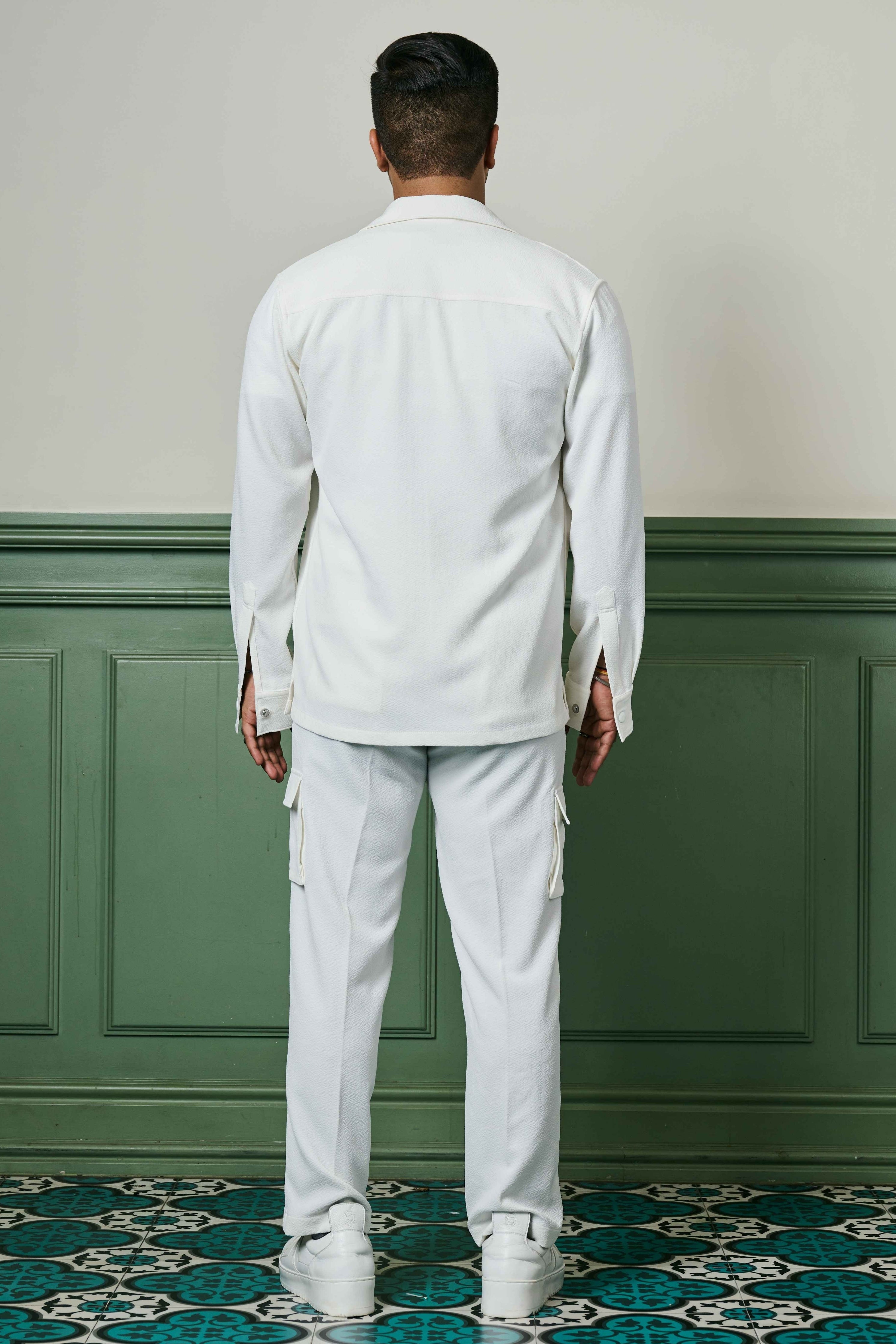 This White Biscuit Crepe Co-Ord Set, Featuring A Classic Collared Jacket And Relaxed-Fit Trousers. The Shirt Boasts A Modern Geometric Texture, Chest Pockets With Flap Closures, And A Button-Down Front, Offering Both Style And Functionality. Paired With Matching Trousers That Include Side Cargo Pockets And An Elastic Waistband For Comfort, This Co-Ord Set Is Perfect For A Contemporary, Chic Look. Ideal For Casual Outings Or Semi-Formal Events, This Set Ensures You Stay Fashionable And Comfortable Throughout The Day.